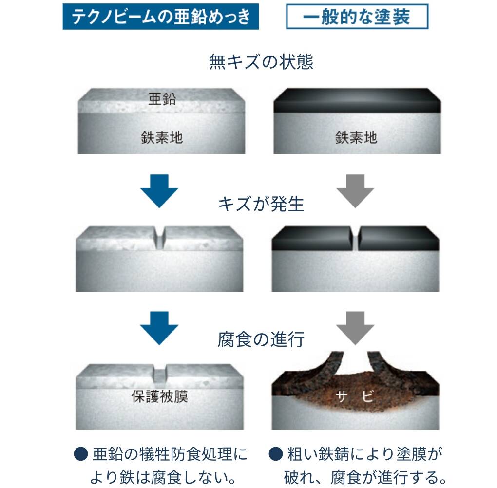 テクノビームの鉄部分には、サビや腐食から守るために「溶融亜鉛めっき処理」を施しています。